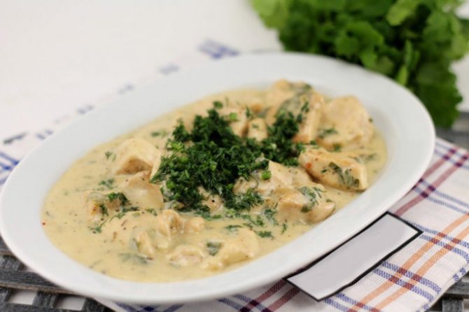 Після додавання води соус повинен рівномірно покривати всі шматочки курки, і в ньому грудки будуть гаситися на повільному вогні 30-40 хвилин. Якщо після закінчення цього часу сметанна підливка все ще залишається рідкою, її можна буде згустити невеликою кількістю борошна.