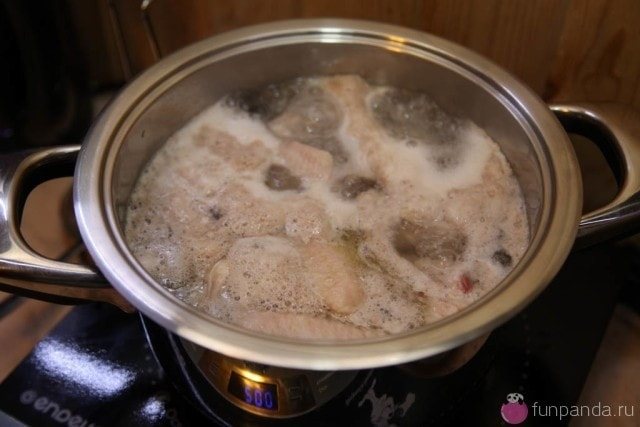 2. Розділені крила кладемо в підсолену воду, ставимо на вогонь і доводимо до кипіння. Тут також є свої хитрощі. Як тільки вода закипіла, знімаємо піну і забираємо каструлю з вогню. Тепер прямо в бульйоні повністю остудити крильця до кімнатної температури. Думаєте, не зварилися? Фіг там! Більш ніжного курячого вареного м’яса я в житті не пробувала! Справа в тому, що таким невеликим шматочкам не потрібне тривале варіння, а в гарячому бульйоні вони дійдуть до потрібної готовності. До речі, цей етап можна зробити напередодні вечірки, залишивши каструльку з крильцями у прохолодному місці. Тільки не дивуйтеся, коли наступного дня виявите в каструлі справжній курячий холодець — у крильцях міститься дуже багато речовин, що желюють ))