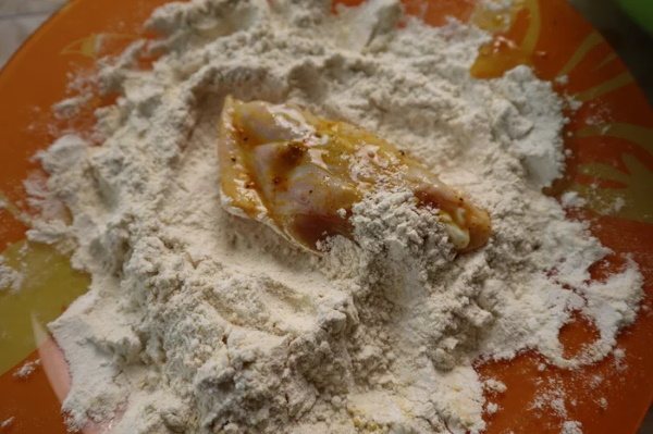 - Змішати в сухій мисці борошно зі спеціями для курки та сіллю.