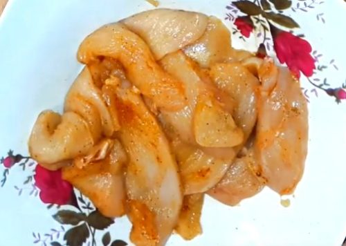 Для страви зазвичай береться філейна частина курки, вона найменш жилиста. Обов’язково залиште м’ясо маринуватися – так виходить смачніше, варіанти маринадів дивіться в іншій статті.
