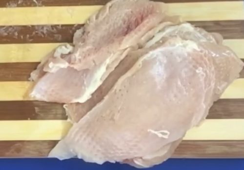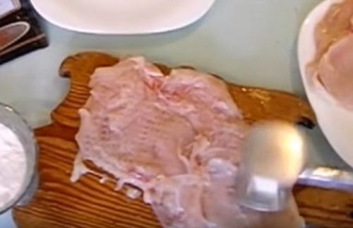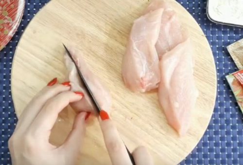 2. Гострим ножем наріжте філе тонкими пластинами, відбийте кухонним молотком з обох боків. Не варто старатися занадто сильно – куряче м’ясо досить ніжне саме собою.