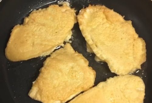 7. Розігрійте сковорідку з олією, зменшіть вогонь до середнього і викладіть туди філе кляром униз. Відразу на інший бік викладіть щільний шар кляру. Коли куряче філе знизу обсмажиться до золотистої скоринки, переверніть і готуйте з іншого боку.