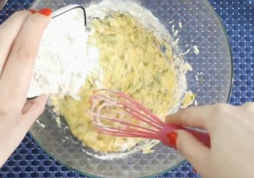 5. Крізь дрібну тертку пропустіть сир і додайте його до яєць, знову все розмішайте. Потім введіть муку|борошно| і знову перемішайте до однорідного стану.