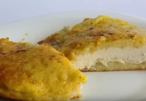 Завдяки кляру з картоплі та сиру філе курки просочується додатковим соком, не виділяючи при цьому свій, тому виходить особливо ніжним, м’яким та соковитим. Суміш смаженої тертої картоплі з сиром робить смак непередаваним, покриваючи апетитною скоринкою філейний шматочок. Більше того, страва виходить справді дуже ситною.