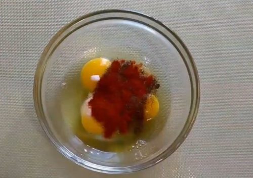 3. Тепер можете розпочати приготування кляру. У глибоку тарілку розбийте 3 яйця. Посоліть, додайте спеції. Все добре перемішайте.