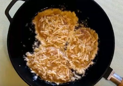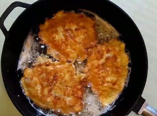 Швидше за все, заготівлі доведеться обсмажувати за кілька прийомів. Коли закінчиться остання порція, поверніть усі шматочки назад, у сковорідку. Вимкніть конфорку.