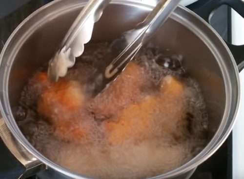 6. У каструлю вилийте соняшникову олію і добре її прогрійте на сильному вогні. Потім зменшіть його до мінімуму і відправте туди куряче філе у необхідній кількості – олія повинна покривати її. Готуйте 3-4 хвилини з кожної із сторін.