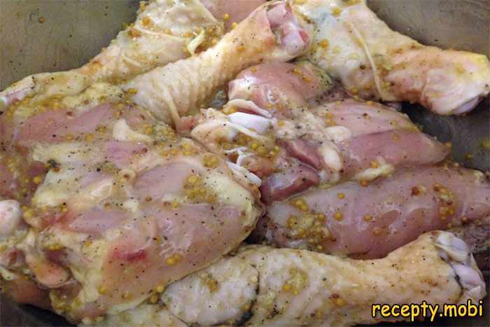 Складаємо у відповідну за розміром чашу та заливаємо медово-гірчичним маринадом. Добре перемішуємо і прибираємо стегенця в холодильник хоча б на годину. Якщо ж ніжки спонукають у маринаді кілька годин, то це зробить їх тільки смачнішими та соковитішими.