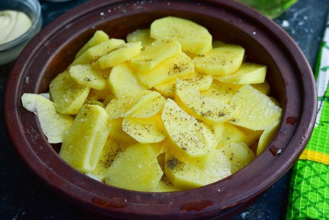3. Очистіть картоплю, вимийте її, а потім наріжте кружальцями або соломкою. Викладіть нарізаний овоч зверху на цибулю. Посоліть і поперчіть.