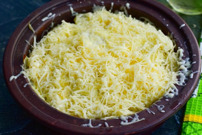 5. Накрийте форму фольгою та відправте її в розігріту до 190 градусів духовку на 50-60 хвилин. Твердий сир натріть на дрібній тертці.