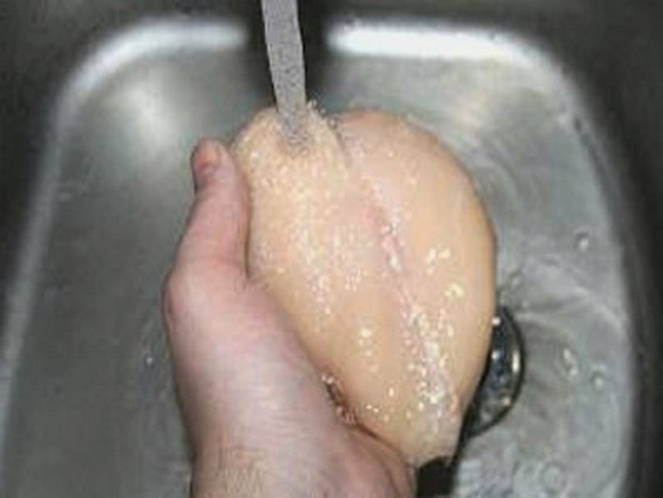 - Перевіряємо курячі грудки. Якщо є плівки та жилки, видаляємо їх, використовуючи гострий ніж. Промиваємо м’ясо під струменем теплої води. На кухонному столі розкладаємо пару паперових рушників та обтираємо грудки. Для подальшого приготування їх можна розрізати навпіл чи залишити цілими.