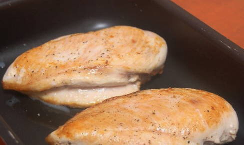 - Перевіряємо курячу грудку на наявність плівок та жилок. Якщо вони є, вилучаємо їх. Промиваємо м’ясо теплою водою. Вбираємо зайву рідину паперовими рушниками. Розрізаємо грудку гострим ножем вздовж на дві частини. Беремо форму для запікання та злегка змащуємо її олією. Викладаємо у форму шматки грудки. Солимо і посипаємо спеціями.