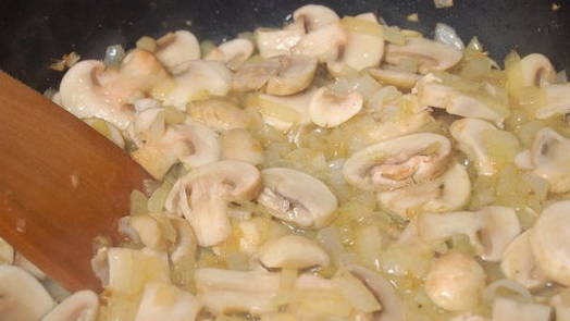 - Поки наша грудка запікається, займемося вершковим соусом. Очищаємо печериці та цибулю. Вимиваємо гриби та кріп теплою водою, трохи обсушуємо і починаємо нарізати. Печериці нарізаємо шматочками середнього розміру, а цибуля та кріп – дрібно. Знову наливаємо в сковороду олію і ставимо ємність на конфорку. Вмикаємо плиту. Через хвилину викладаємо цибулю і обсмажуємо її 5 хвилин, потім відправляємо гриби і знову обсмажуємо протягом 5 хвилин. Помішуємо цибулю та печериці лопаткою.