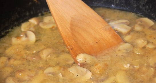 - Через 2 хв. після закипання слід додати курячий бульйон, проварити суміш 5 хв., з’єднати з грибами та нагріти. Після цього потрібно залити вершки, покласти петрушку, розмішати та продовжити готувати соус до загусання на максимальному вогні 1 хв.