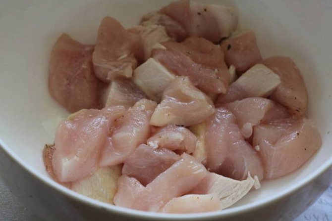 - Курячі грудки позбавляємо плівок і жилок, промиваємо в теплій воді і нарізаємо спочатку довгастими шматочками, а потім кубиками.