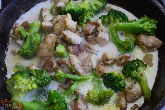 - Повертаємо куряче філе в сковороду із цибулею. Очищаємо броколі, промиваємо водою та висушуємо. Потім розрізаємо броколі на суцвіття. Викладаємо в сковороду та заливаємо інгредієнти вершками.