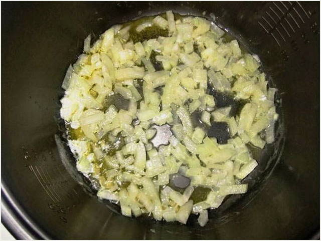 - Підготуємо необхідні інгредієнти. Очищаємо цибулю від плівок та лушпиння. Нарізаємо цибулину на дрібні шматочки та викладаємо на тарілку. Включаємо мультиварку, встановлюємо режим випічки на 55 хвилин і наливаємо в чашу олію. Розігріваємо масло, через 5 хвилин висипаємо цибулю і обсмажуємо в мультиварці 20 хвилин до золотистого кольору.