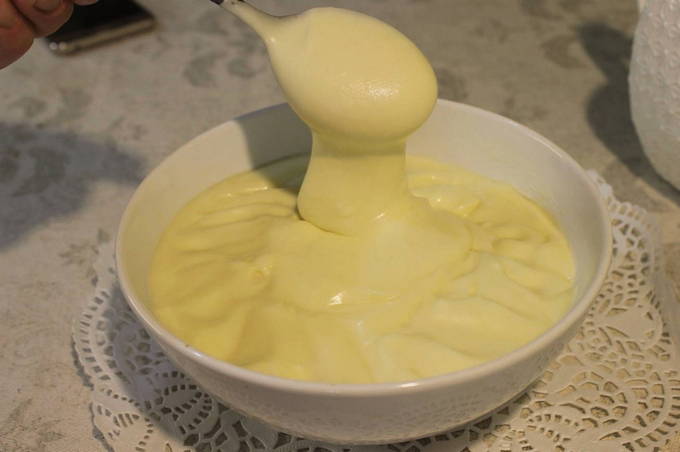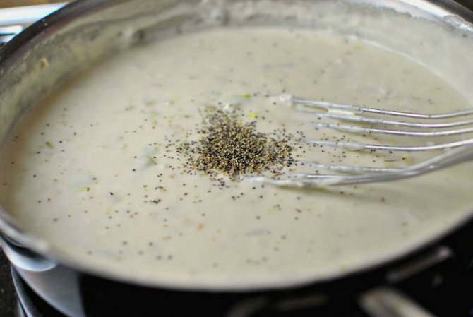 - Щоб приготувати підливу, з’єднайте тертий сирок із вершками, щіпкою солі, майонезом та невеликою кількістю перцю. Прогрійте суміш, домігшись потрібно консистенції.