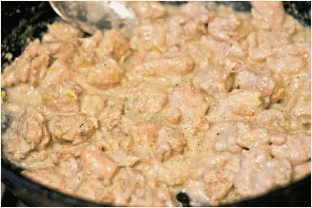 - М’ясо трохи обсмажилося, трохи побіліло. Тепер додаємо плавлений сир.