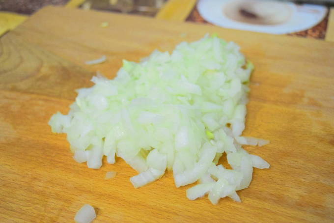 - Очищаємо цибулю від лушпиння, нарізаємо на дрібні кубики. Вливаємо олію в сковороду. Ставимо її на конфорку і вмикаємо плиту. Розігріваємо ємність з олією одну хвилину. Потім висипаємо цибулю та обсмажуємо до золотистого відтінку.