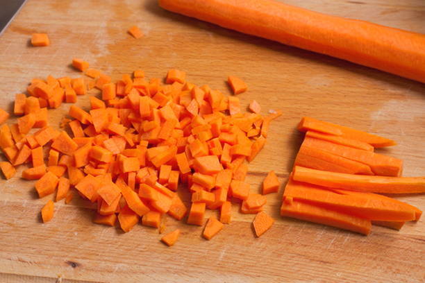 - Моркву очищаємо, змиваємо бруд губкою та нарізаємо на невеликі кубики. Додаємо моркву до цибулі, обсмажуємо до готовності.