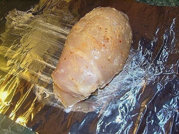 - Дістаємо з духовки деко. Беремо аркуш фольги і розстеляємо на ньому. На кожну скибочку курячого філе викладаємо столову ложку овочів і згортаємо, щоб вийшли рулетики. Викладаємо їх на фольгу.