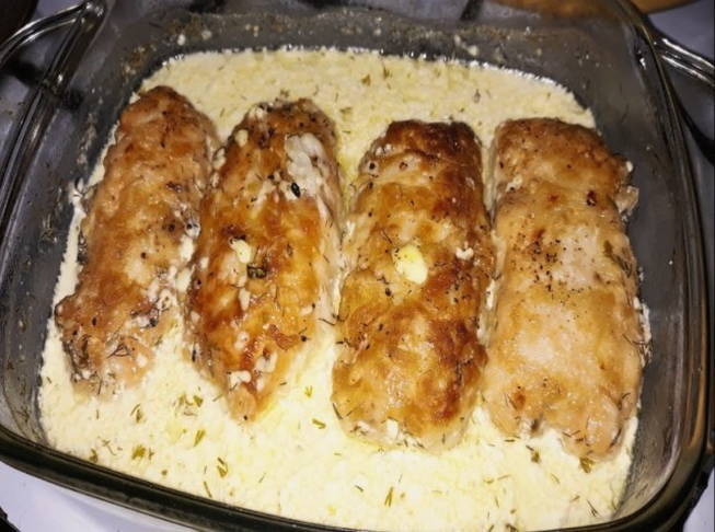 Страва виходить дуже ароматною та ніжною. Вершки та часник разом просочують досить сухе куряче м’ясо повністю і роблять його дуже соковитим, а тертий сир створює приємну хрумку скоринку на поверхні м’яса.