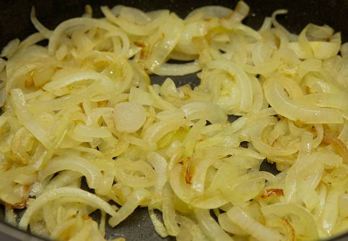 - Відрізаємо невеликий шматочок вершкового масла|мастила| і викладаємо його в сковороду. Ставимо ємність на конфорку. Беремо цибулину і очищаємо її від лушпиння. Злегка обтираємо серветкою, змоченою водою. Нарізаємо цибулину півкільцями. Включаємо плиту і чекаємо, поки розігріється сковорода та розтане масло. Потім висипаємо в сковороду цибулю та обсмажуємо її до золотистого кольору.