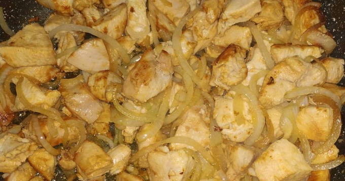 - Оглядаємо курячі грудки і прибираємо всі плівки та шкірки. Промиваємо м’ясо у теплій воді. Обсушуємо та нарізаємо м’ясо на шматочки невеликого розміру. Викладаємо курячі кубики до обсмаженої цибулі. Посипаємо інгредієнти розмарином та перцем.