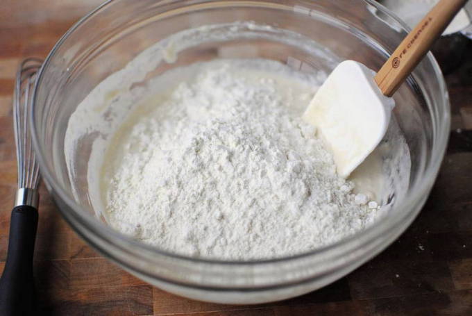 - В окрему глибоку тарілку або миску наливаємо вершки і додаємо пшеничне борошно, помішуючи вершки, щоб не утворювалося грудочок.