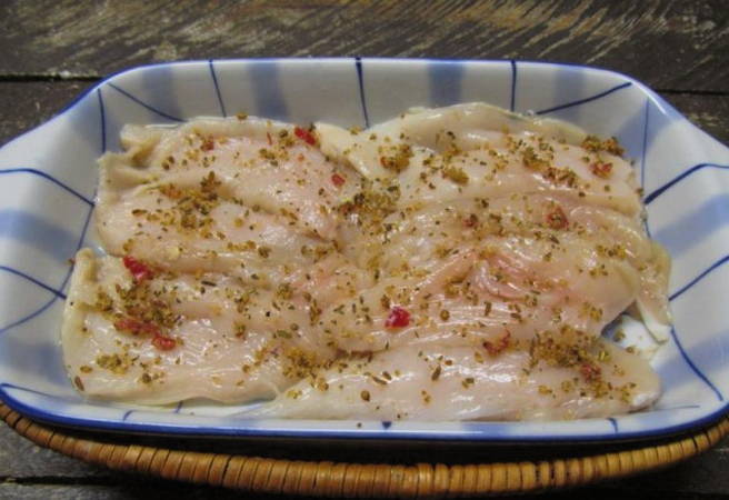 - Куряче філе перевіряємо на наявність шкірок, жилок та хрящів. Позбавляємося їх за допомогою ножа. Промиваємо м’ясо проточною водою та обсушуємо за допомогою паперового рушника або серветок. Викладаємо філе у велику глибоку миску. Посипаємо спеціями.