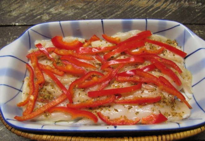 - Промиваємо перець водою і злегка обсушуємо серветкою. Потім розрізаємо його навпіл, очищаємо від серцевини, вирізаємо білу шкірку. Знову промиваємо обидві половинки перцю та нарізаємо його соломкою. Поступово викладаємо його на курячу грудку.