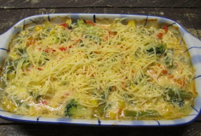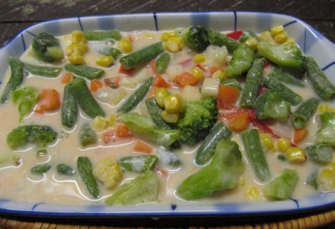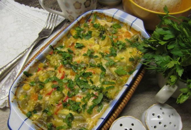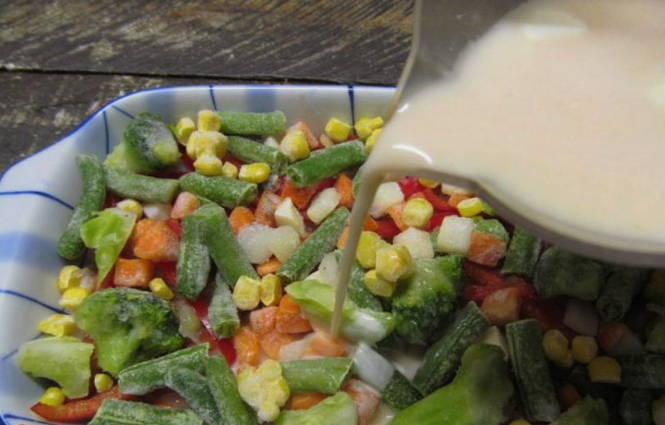 - Поверх перцю розподіляємо заморожені овочі.