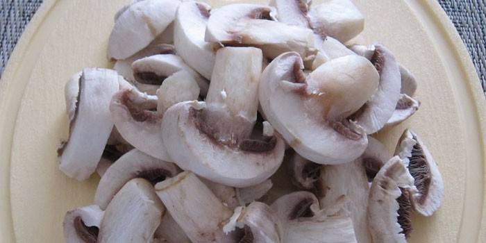 Дрібним кубиком нарізати свіжі гриби, часник. Натерти на тертці дрібно сир.