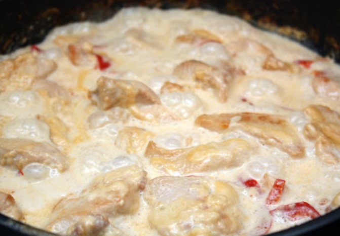 Навіть у ситого гостя здатна викликати апетит ароматна курка у вершках на сковороді. Рецепт з додаванням перцю та паприки сподобається любителям ніжного, але самобутнього смаку цього овочу. Його насичений аромат відмінно відтіняє нейтральне м’ясо курки. Якщо ви бажаєте додати яскравих фарб, використовуйте перці різних кольорів.