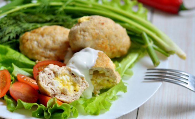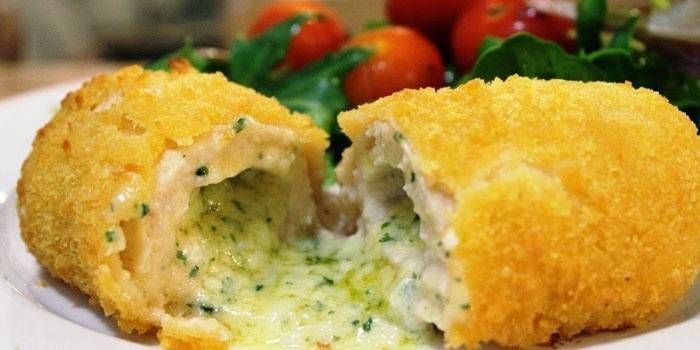 Готується страва із відбивного курячого філе. Необхідна начинка із вершкового масла, зелені. Начинку додають гриби, сир, яйця, готовий продукт ніщо не зіпсує, все одно вийде дуже смачно. Готується близько години.