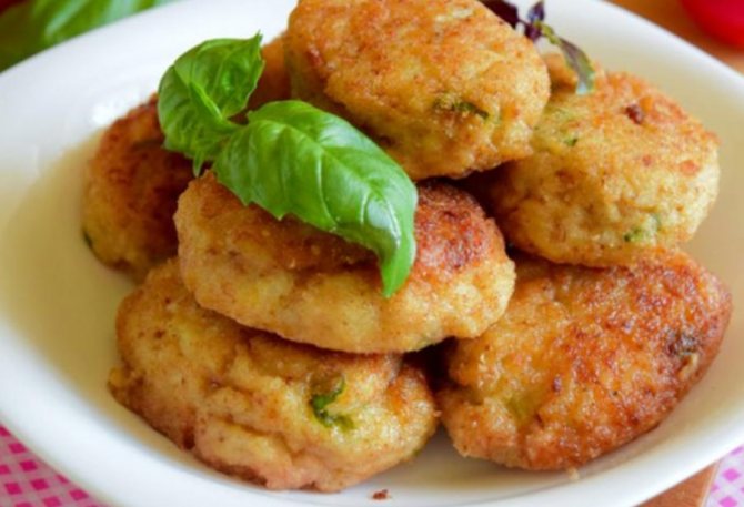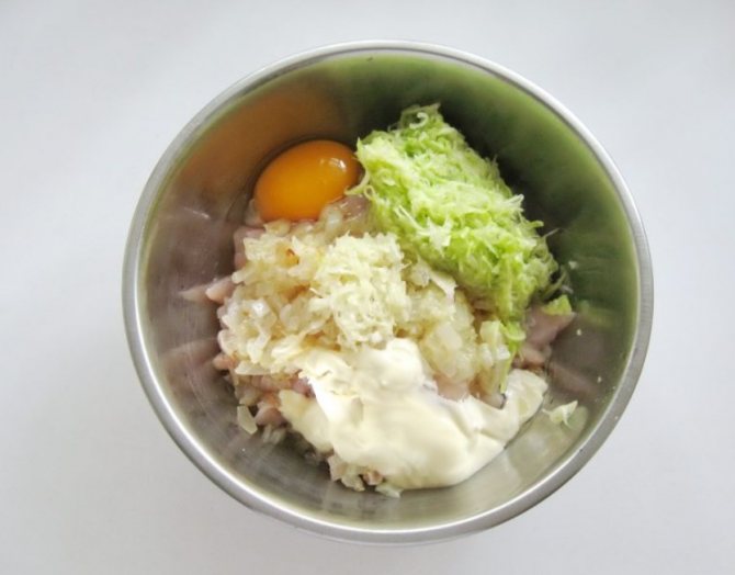 М’ясне філе відбивають молоточком і дрібно рубають ножем. Нарізають цибулю, підсмажують її на олії, змішують із куркою. Кабачок труть на тертці, віджимають сік, переносять до м’яса. Туди ж відправляють яйце, майонез, різаний часник, манку, сіль, перець, замішують. Можна внести улюблені приправи. Маса настоюється півгодини. На сковорідку викладають ложкою м’ясну суміш, обсмажують з обох боків. На 10 хвилин відправляють у духовку, щоб вони стали повітряними.