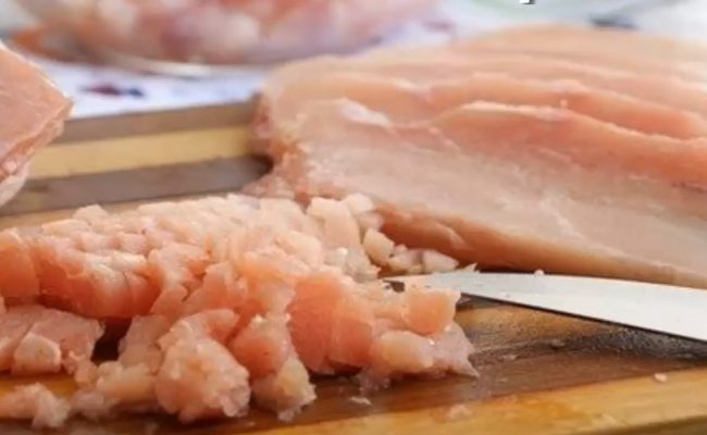 Філе трохи заморожуємо. Нарізаємо на пласти завтовшки 7-8 мм і злегка відбиваємо кухонним молоточком. Потім подрібнюємо маленькими кубиками.