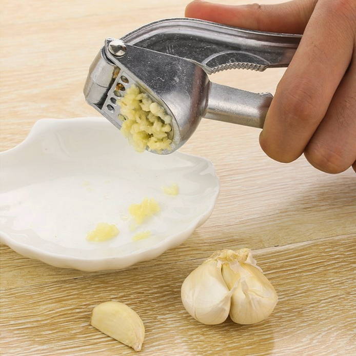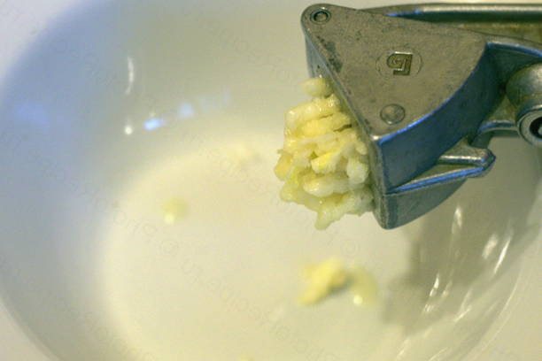 - Часник очищаємо від лушпиння і подрібнюємо за допомогою преса або ножем.