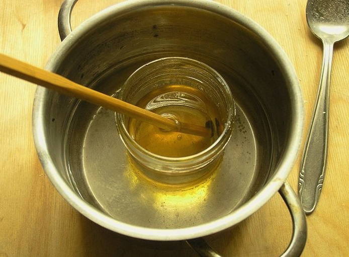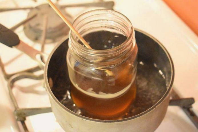 - Мед ставимо на водяну лазню та розтоплюємо до рідкого стану.