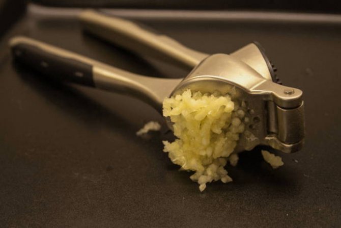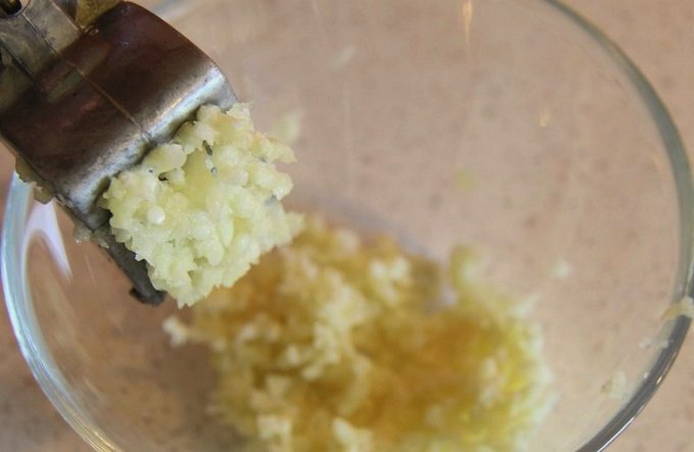 - Часник чистимо від лушпиння і подрібнюємо під пресом, також можна натерти на дрібній тертці.