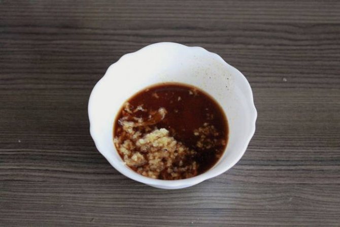 Тепер змішуємо мед із соєвим соусом (якщо мед закристалізувався, можна до нього додати трохи води, щоб розбавити). Чищений часник подрібнюємо часнодавилкою або просто рубаємо ножем і також додаємо в маринад. Додаємо і спеції.