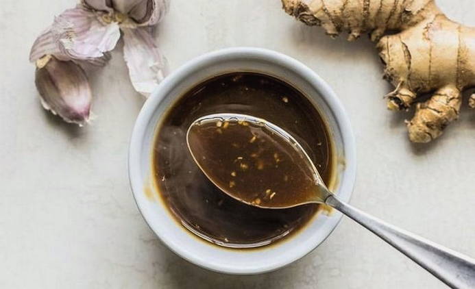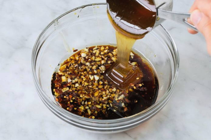 - Змішуємо 1 ст. меду, 5 ст.л. соєвий соус, часник, сіль, імбир і червоний мелений перець.