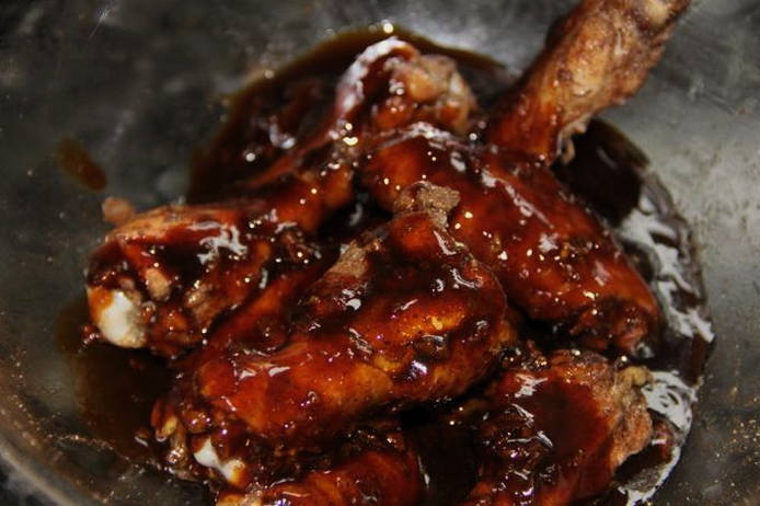 - Курячі ніжки обвалюємо в готовому соусі, кладемо в миску і заливаємо маринадом. Ставимо в холодильник на 20-30 хв, щоб м’ясо просочилося ароматами соусу.