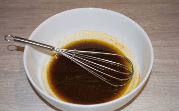- Змішуємо мед, соєвий соус, гірчицю, часник, сіль, коріандр та червоний мелений перець.