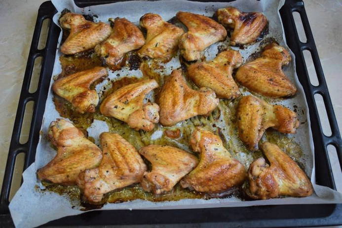 - Розігріваємо духовку до 180 градусів. Деко рясно промазуємо рослинним маслом і викладаємо на нього курячі крильця. Ставимо в духовку та запікаємо 40 хв., через 20 хв. перевертаємо на інший бік, щоб рум’яна скоринка була з усіх боків.