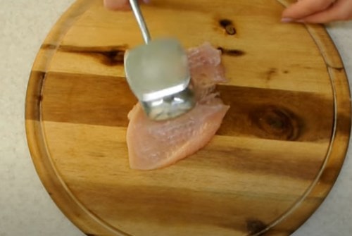 - Попередньо слід підготувати всі необхідні продукти, а це означає, що потрібно промити дуже ретельно обране філе, потім більшу частину відокремити від малого. Далі на дві зовсім рівні частини слід розділити ту частину, яка побільше за розміром, їх потрібно буде кухонним молоточком відбити зовсім небагато.