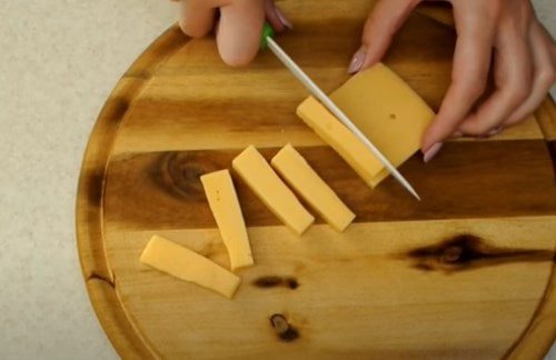 - Нарізати сир тонкими пластинами.