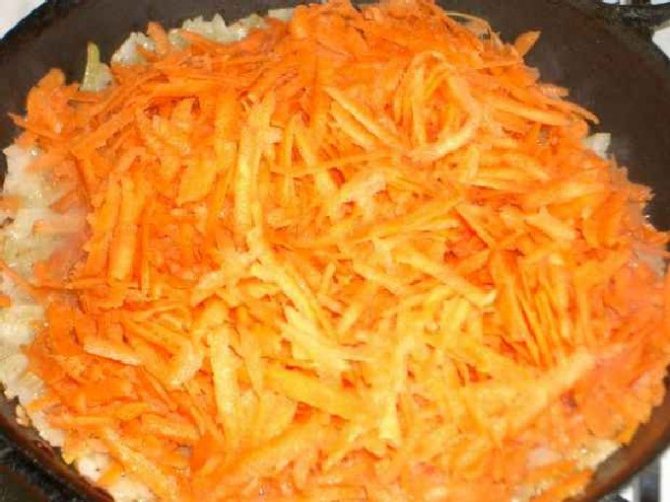 - Нагрійте сковорідку, а потім додайте до неї 2-3 ложки соняшникової олії. Насамперед потрібно обсмажити морквину протягом 10 хвилин. Потім додайте до моркви цибулю та обсмажуйте її до напівготовності. Насамкінець посоліть і поперчіть овочі і добре перемішайте.