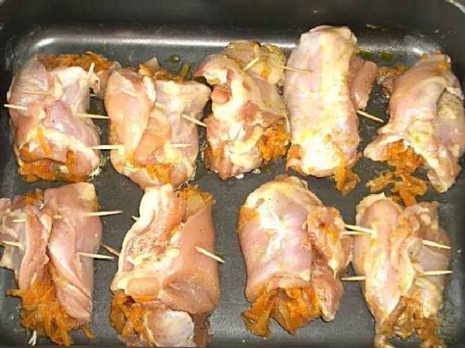 - У форму покладіть курячі рулетики, налийте трохи олії і відправте в духовку на 50-60 хвилин. Запікайте при температурі 180 градусів.